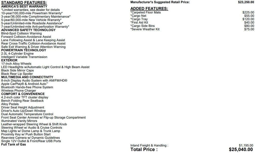 - Radio: AM/FM/HD Display Audio -inc: 8" high resolution touchscreen display, 6 speakers, wireless Apple CarPlay and Android Auto, Bluetooth® hands-free phone system w/voice recognition, dual USB ports and speed-sensitive automatic volume control